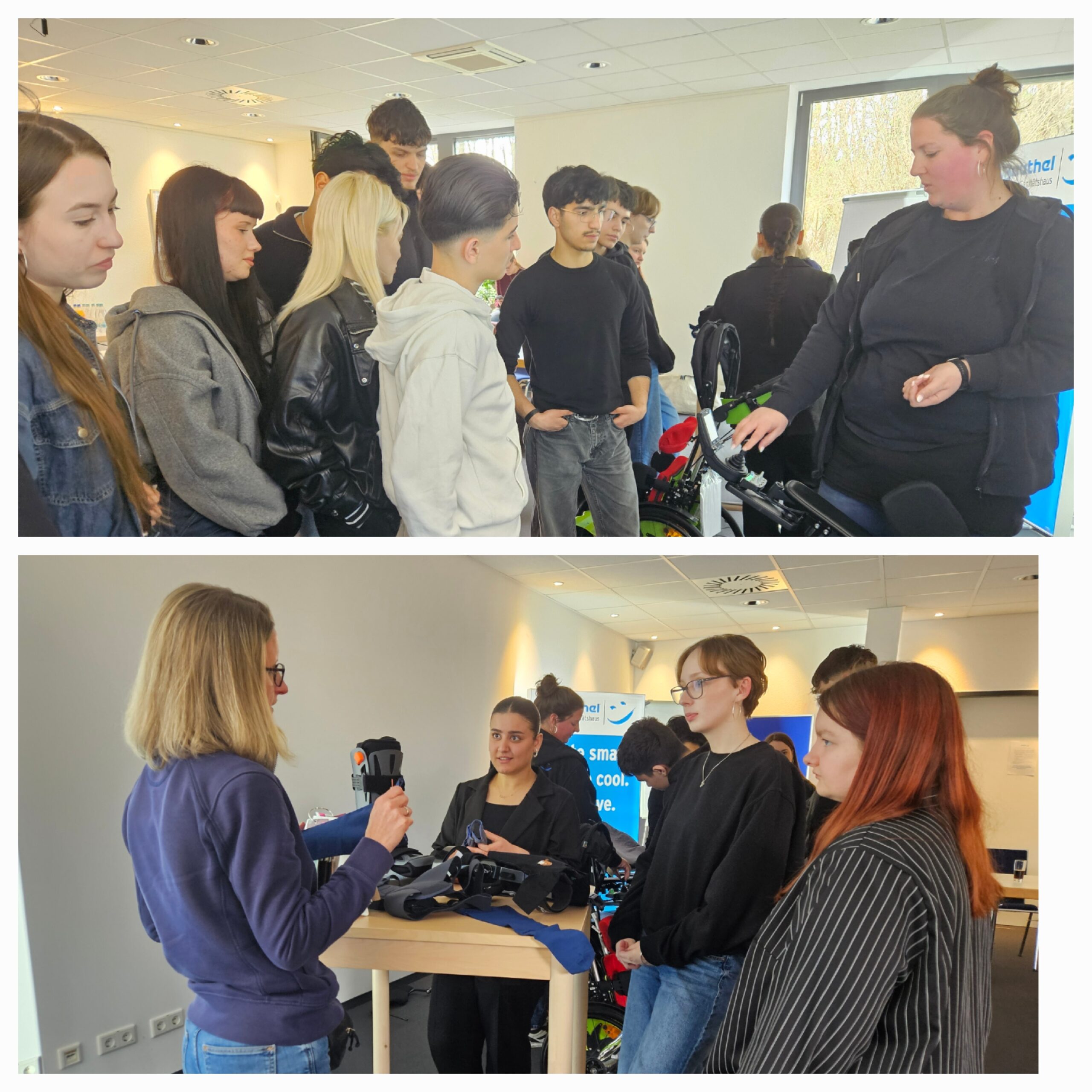 Zu Beginn stellte das Team die verschiedenen Ausbildungsberufe im Betrieb vor und beantwortete offen die Fragen der Schülerinnen und Schüler. Besonders spannend wurde es, als die Gruppe selbst aktiv werden durfte: Hilfsmittel wie Rollstühle, Orthesen und Prothesen konnten nicht nur aus nächster Nähe betrachtet, sondern auch ausprobiert werden. So wurde schnell deutlich, wie wichtig und vielseitig die Arbeit in diesem Bereich ist.